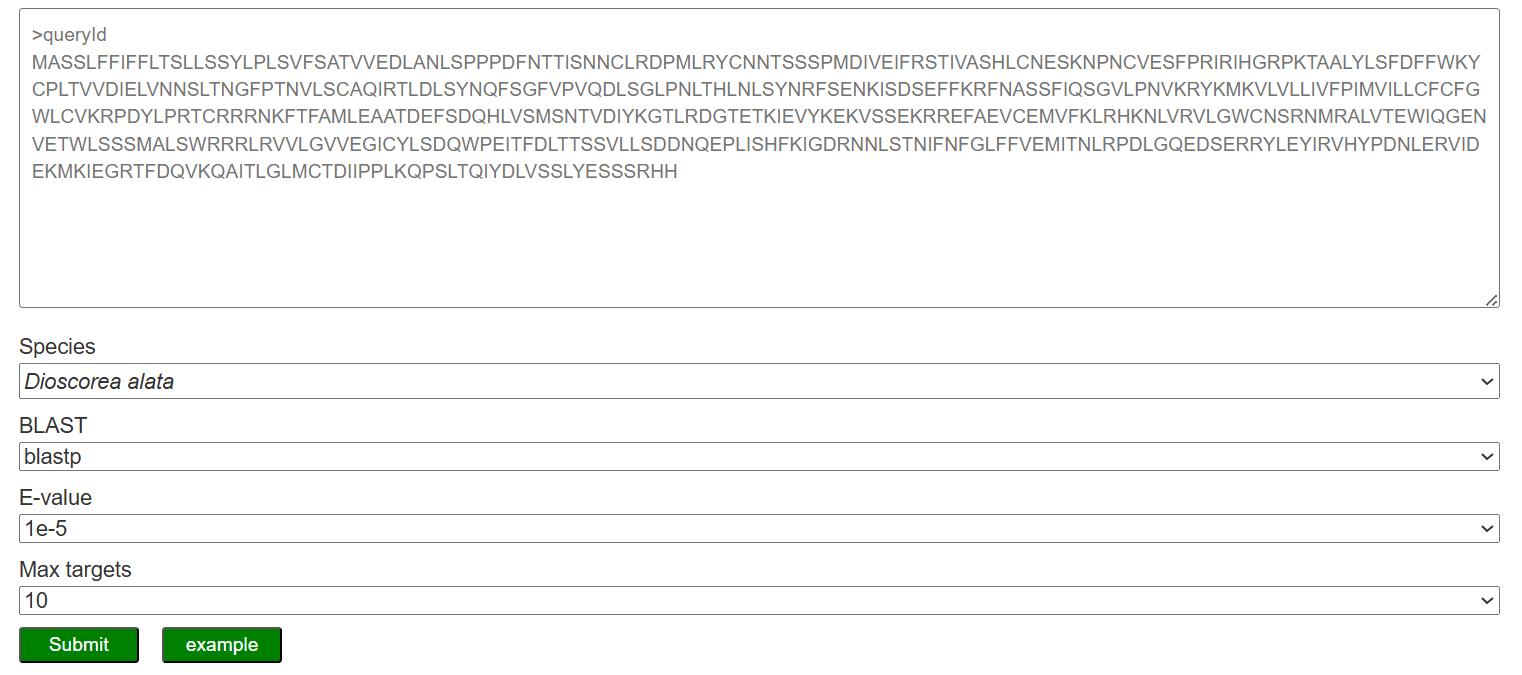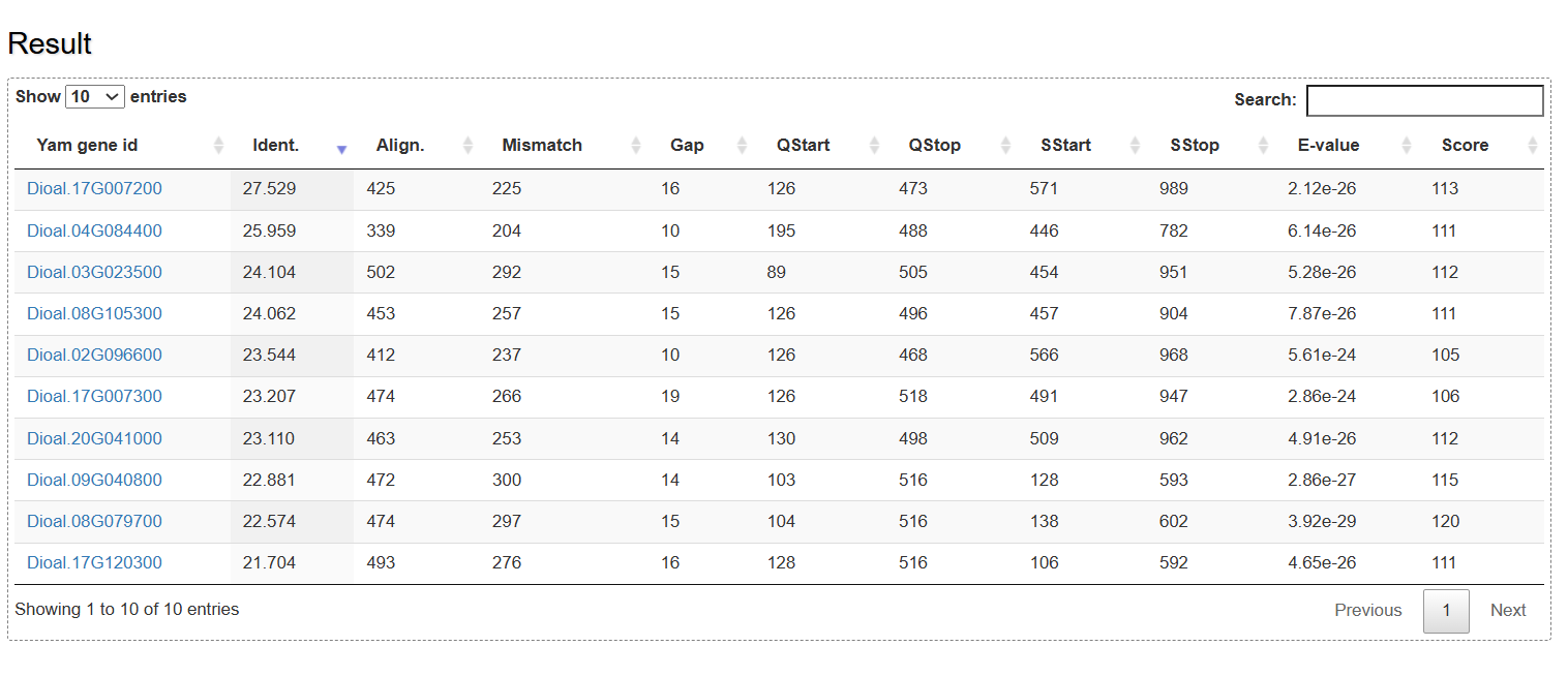 On the BLAST page, users can search yam genes based on sequence similarity using the BLAST program. The queried genes are listed in an interactive table with some parameters such as identity, alignment length, mismatch, gap, evalue and score.