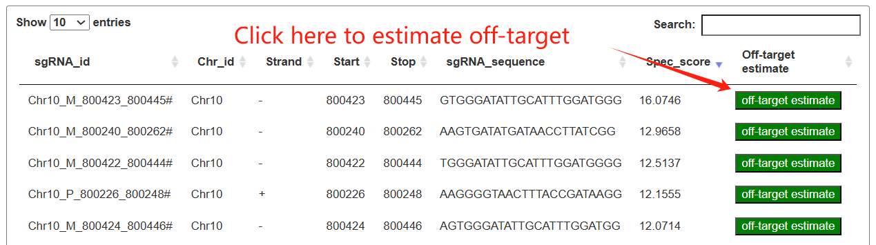 The resulting table lists each sgRNA with its genomic position, strand, sequence, and specificity score, and provides an “off-target estimate” button. By clicking this button, users can view a second table summarizing all predicted off-target sites and their off-target scores, which can be further filtered and searched for detailed evaluation.sers can specify a genomic region as editing object to obtain sgRNAs tailored.
