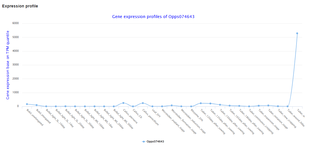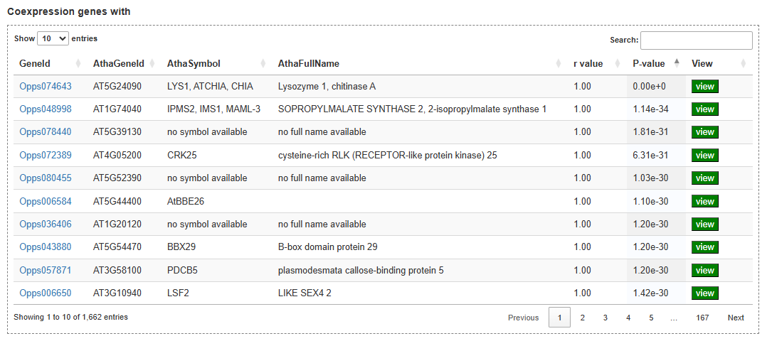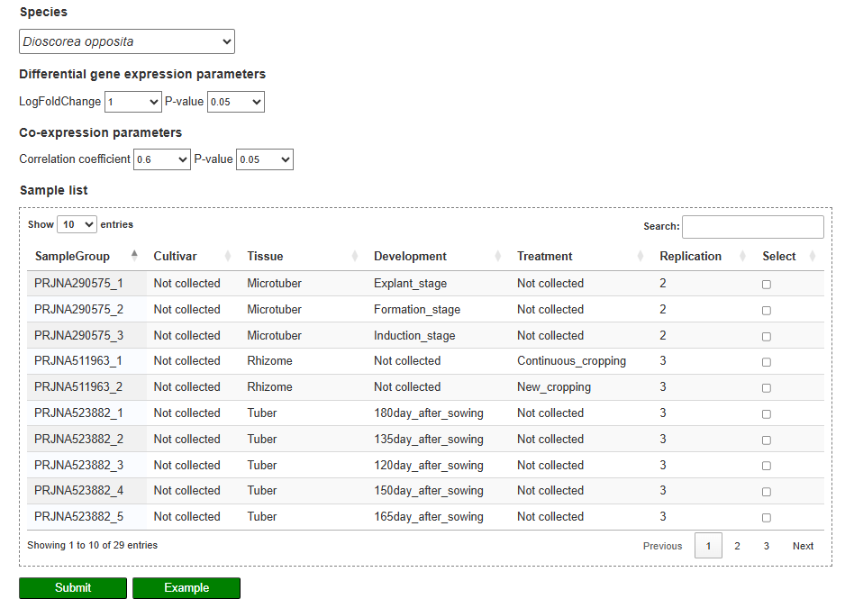 On the expression analysis page, users first choose the species, set thresholds for differential expression and co-expression (log₂ fold change, correlation coefficient, P-values), and select the RNA-seq sample groups to be compared. After submission, the results table lists genes that are significantly differentially expressed or co-expressed, together with statistics such as correlation coefficient and adjusted P-value, and provides links to view each gene in detail. By clicking on a gene ID, users can visualize its expression profile across all selected tissues, developmental stages, and treatments in an interactive line chart.