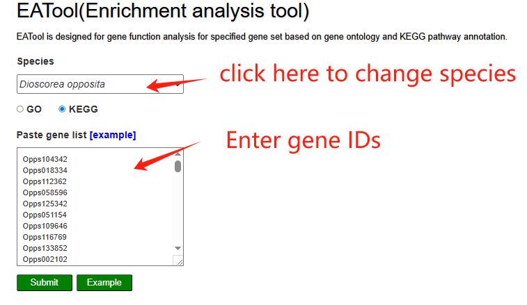 On the enrichement analysis page, users select the yam species, choose GO or KEGG and paste a list of gene IDs for enrichment analysis in the input panel. The results table lists significantly enriched pathways and allows users to expand each row to view the detailed genes contributing to that pathway. A bubble plot visually summarizes the enriched KEGG pathways, where bubble size reflects the gene ratio and color indicates the significance level.