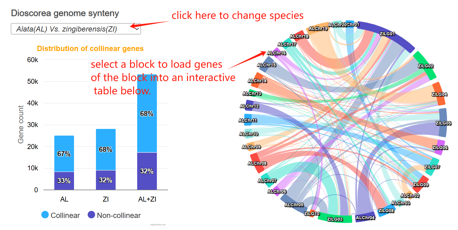 The genome synteny page comprises three main sections. The first section is a stacked bar chart showing the proportions of collinear and non-collinear genes in two genome and their combined gene set. The second section is a circos plot showing genome-wide collinearity relationships between two genomes. Clicking on any syntenic block will highlight it and load the corresponding collinear genes into the interactive table in Section 3 below.