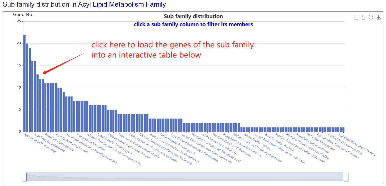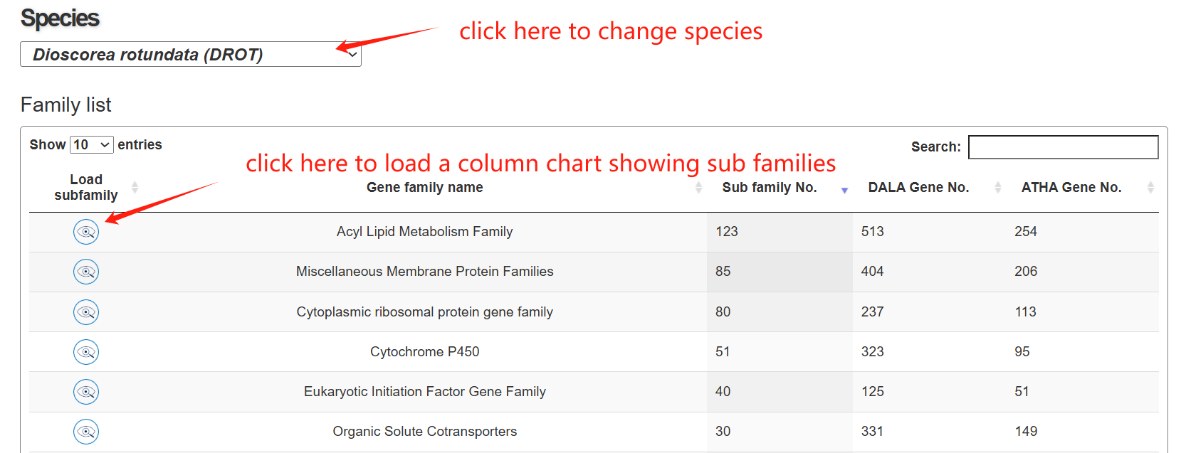The family page comprises three main sections. The first section features an interactive table listing all gene families in the species, along with their corresponding subfamily counts. The second section contains a column chart that depicts the size distribution of subfamilies within a selected gene family. Upon clicking a column, users can load all genes belonging to that specific subfamily into an interactive table displayed in the section below.