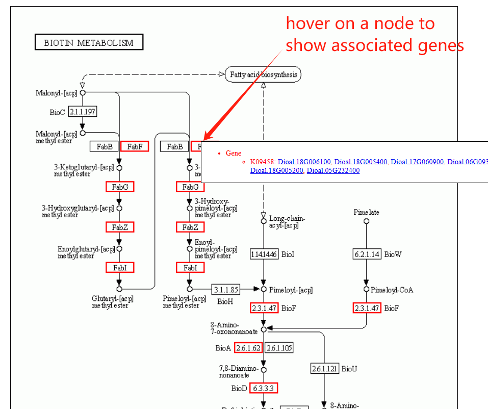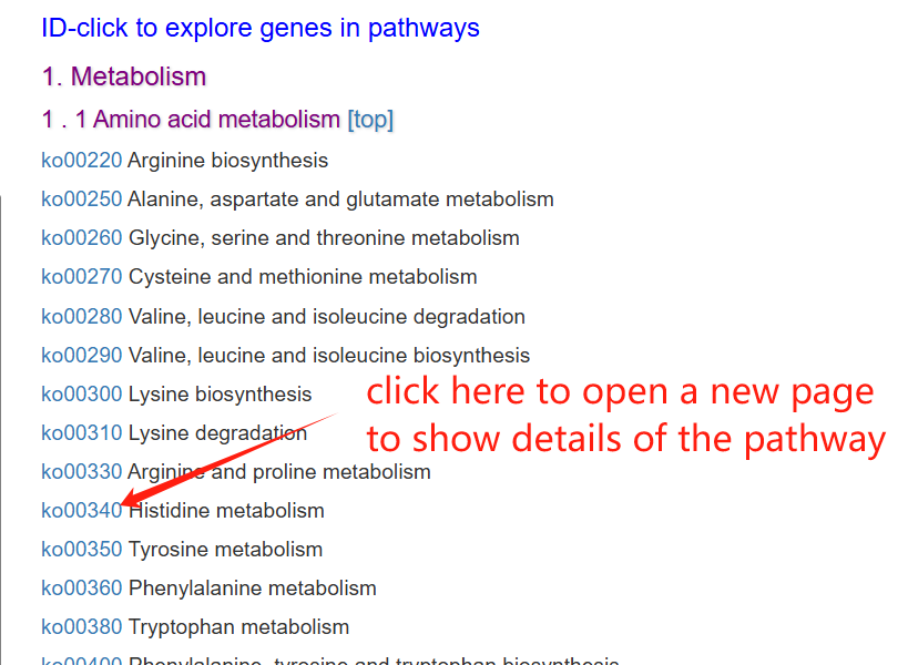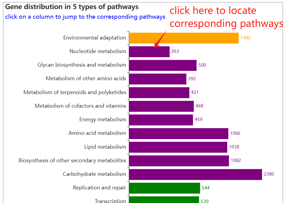 The pathway page features a column chart on the left, displaying gene counts across five major pathway types: Cellular Processes, Metabolism, Environmental Information Processing, Genetic Information Processing, and Organismal Systems. A complete list of all pathways is provided on the right. Clicking on any pathway name opens its dedicated detail page. Additionally, hovering over an ortholog node within the visualization will highlight its associated genes.