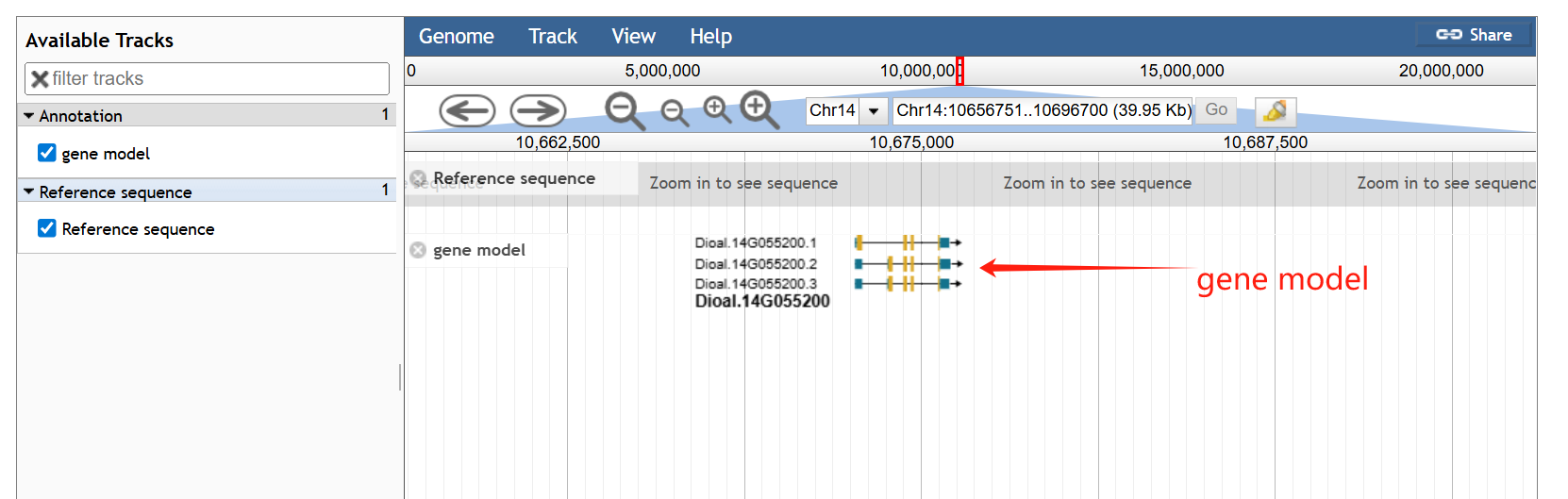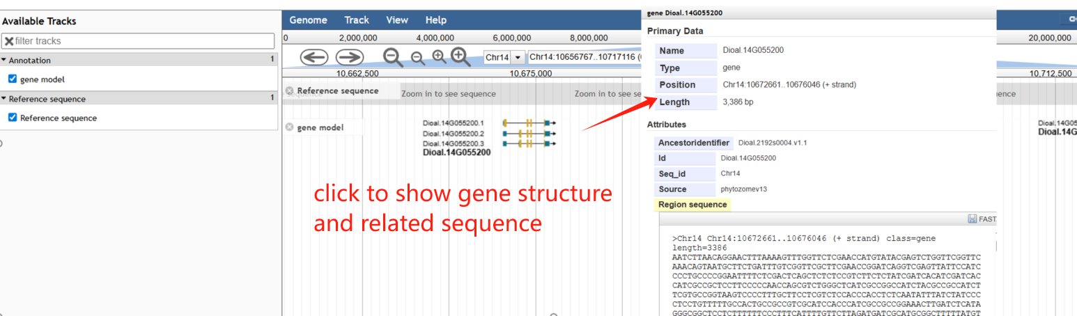 On the genome browser page, JBrowse is used to display the genomic context and gene structures, and to retrieve sequences of interest.