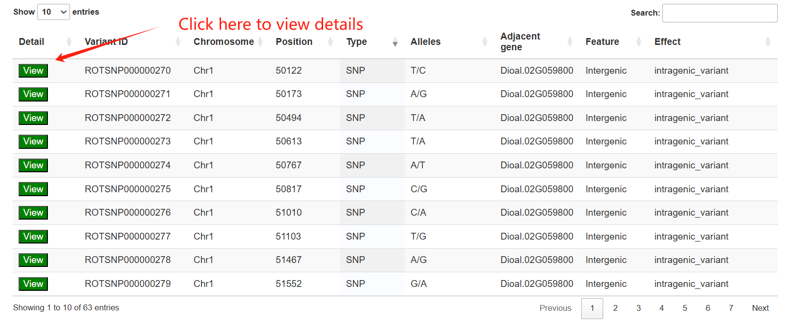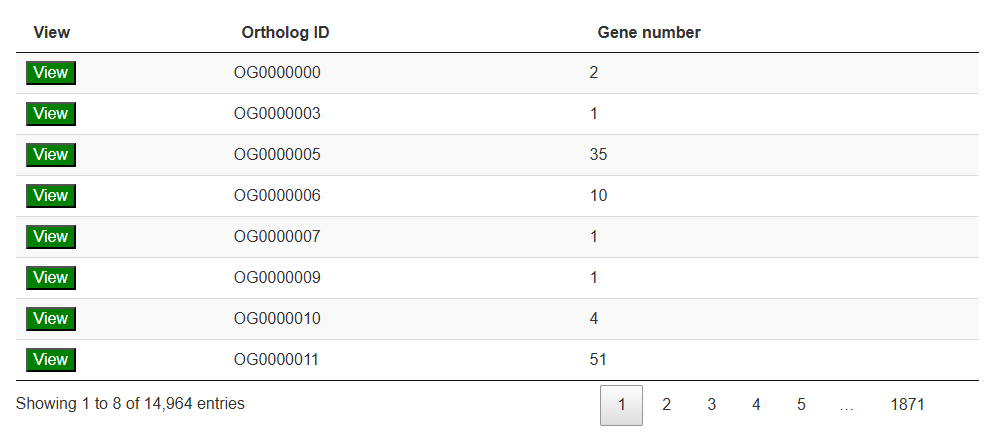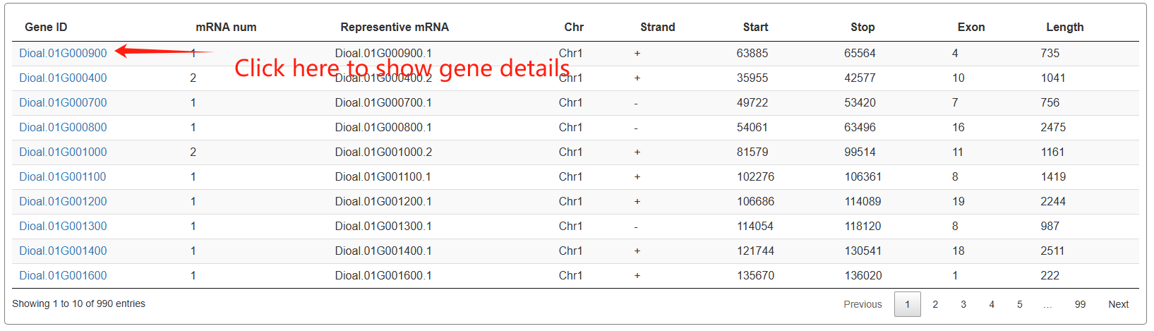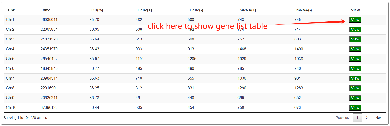 The third section features an interactive table that displays annotation statistics for all chromosomes. When users click the "View" button in the statistics table, a detailed list of all corresponding genes will be presented in the fourth section below.