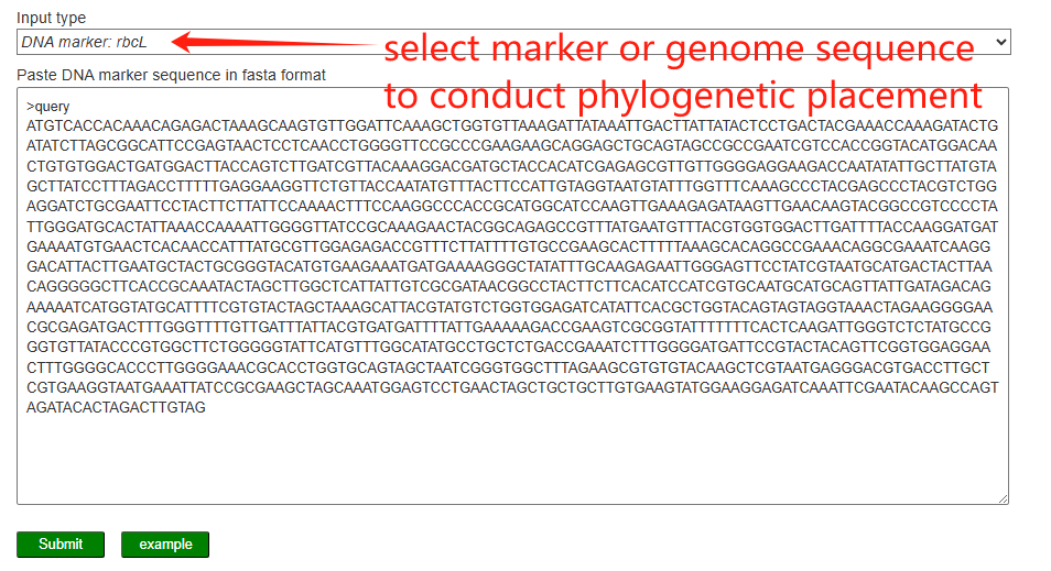 On the Phylogenetic placement page, users select an input type (chloroplast genome or DNA marker, e.g. rbcL) and paste the query sequence in FASTA format. The server then aligns the query to a reference dataset and constructs a phylogenetic tree to place the query within the existing Dioscorea species tree, allowing users to visualize its evolutionary position and closest relatives.