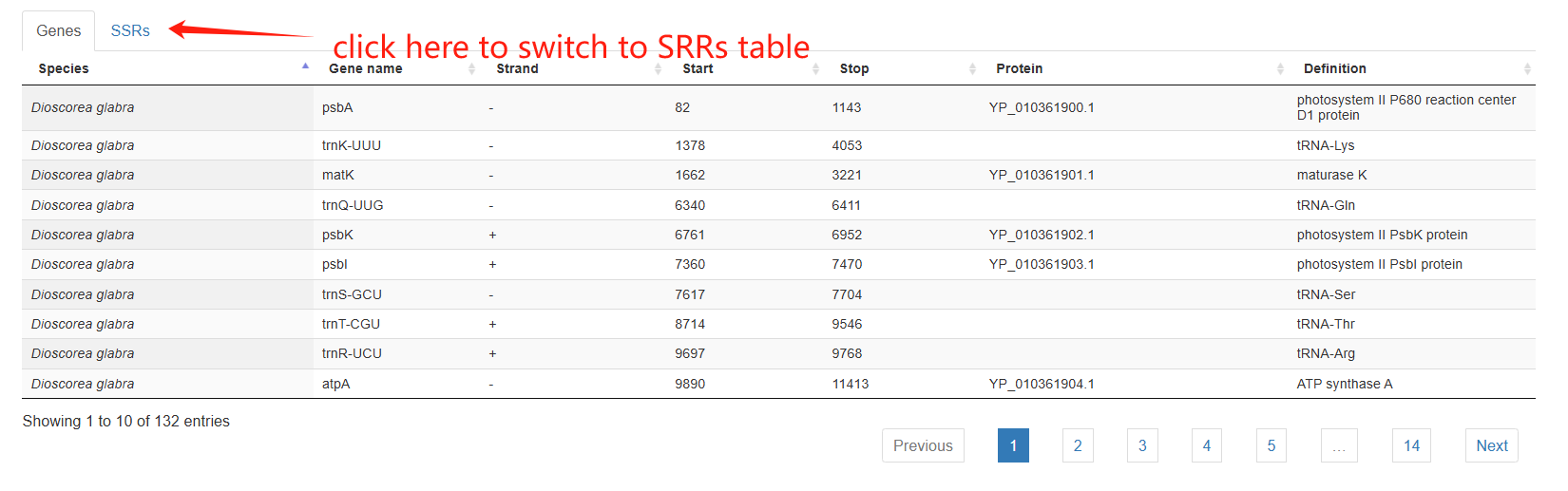 The third section is an interactive table showing the annotated genes and SSRs.