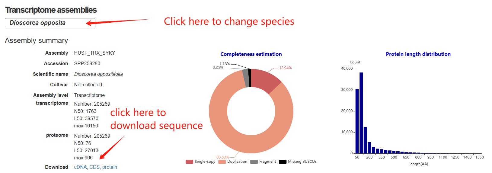 The transcriptome page is composed of five main sections. The first section features a statistical panel that presents key information, including transcriptome assembly details, completeness estimation, and the length distribution of transcript proteins. Users can select different species via a drop-down menu.