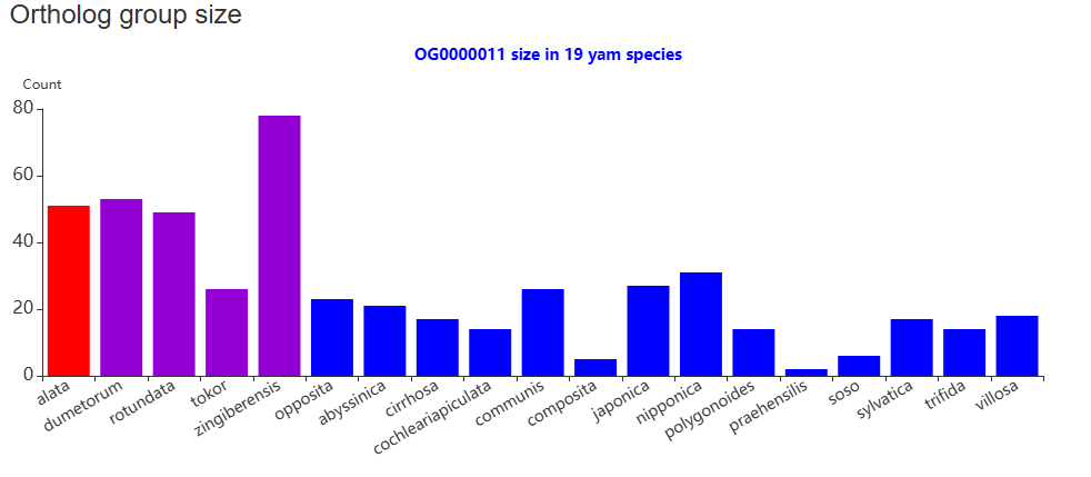 The second section features an interactive table that lists transcripts by ortholog groups. Clicking the "View" button will trigger a column chart below in the third section, which visualizes the ortholog distribution across all yam species.