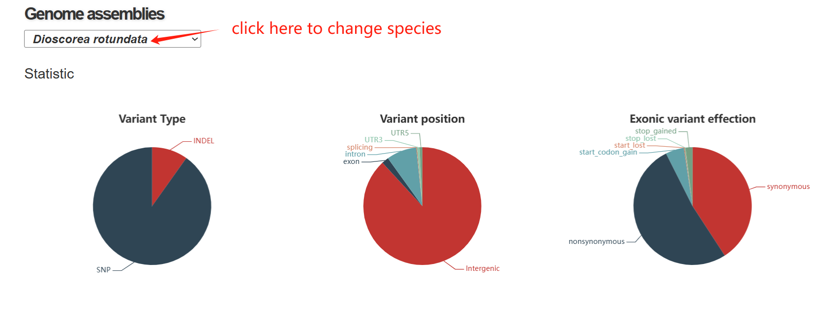 The variome page is composed of three sections. The first section includes three pie: (1) The first pie chart shows the proportion of SNPs and INDELs identified in the dataset, indicating that SNPs constitute the vast majority of detected variants. (2) The second pie chart illustrates the genomic locations of variants, revealing that most mutations occur in intergenic regions, with smaller fractions found in exons, introns, UTRs, and splicing sites. (3) The third pie chart summarizes the functional impact of coding variants, showing the proportions of synonymous, nonsynonymous, and high-impact mutations such as start/stop codon gains or losses.